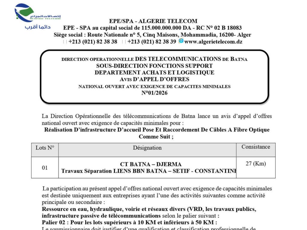- Réalisation d’infrastructure d’accueil pose et raccordement de câbles à fibre optique, Lot N° 01