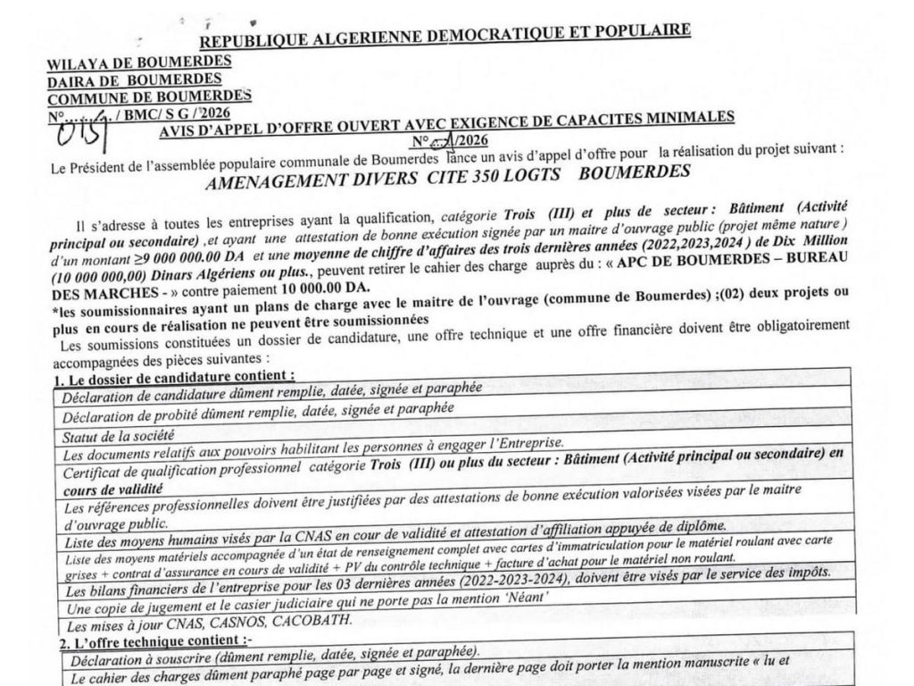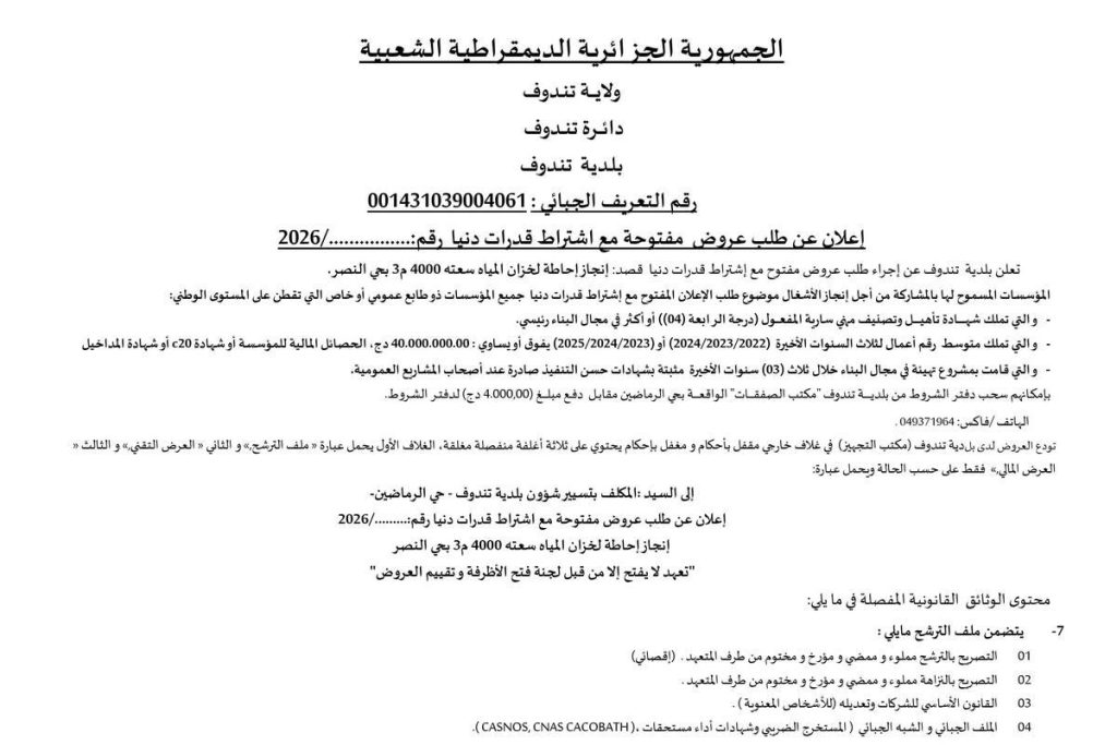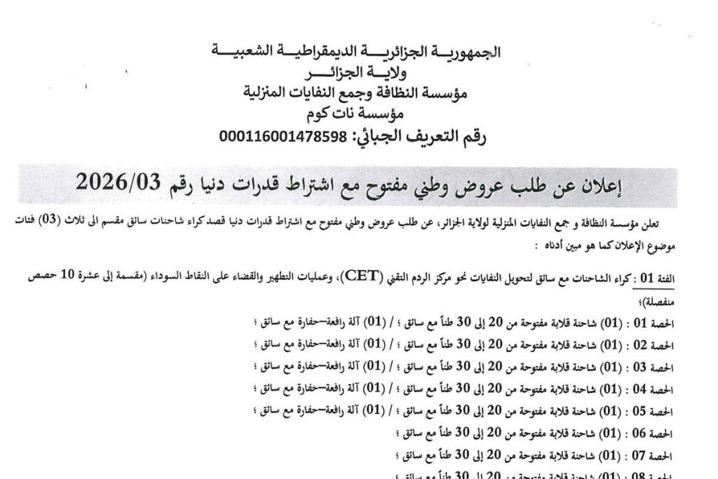 - إعلان عن طلب عروض وطني مفتوح مع اشتراط قدرات دنيا