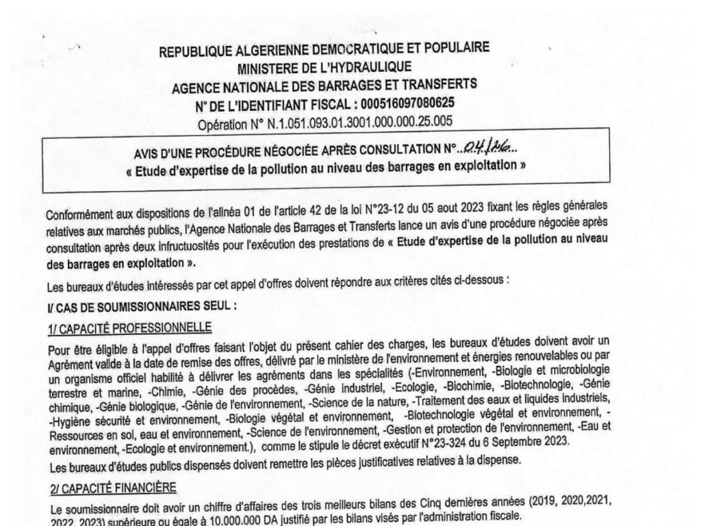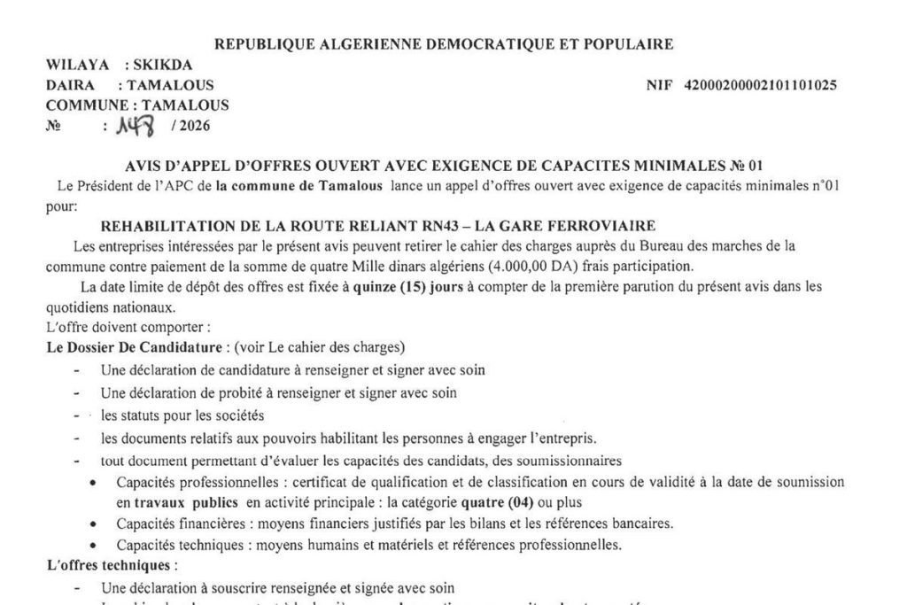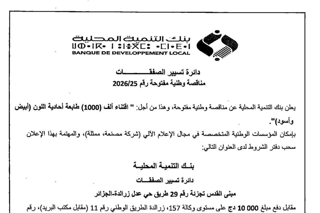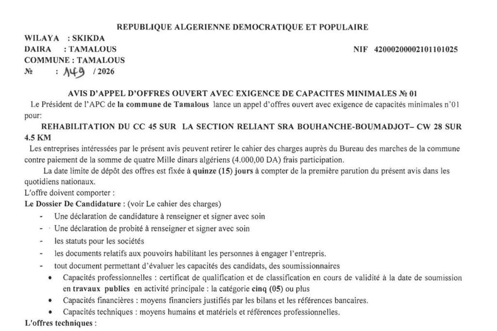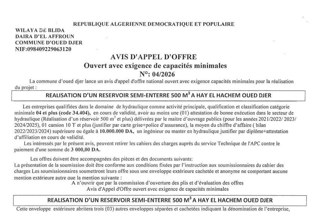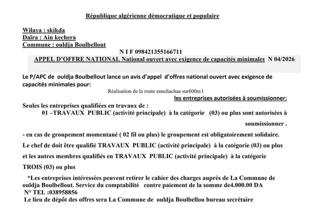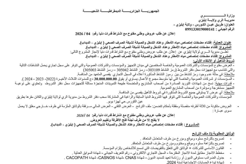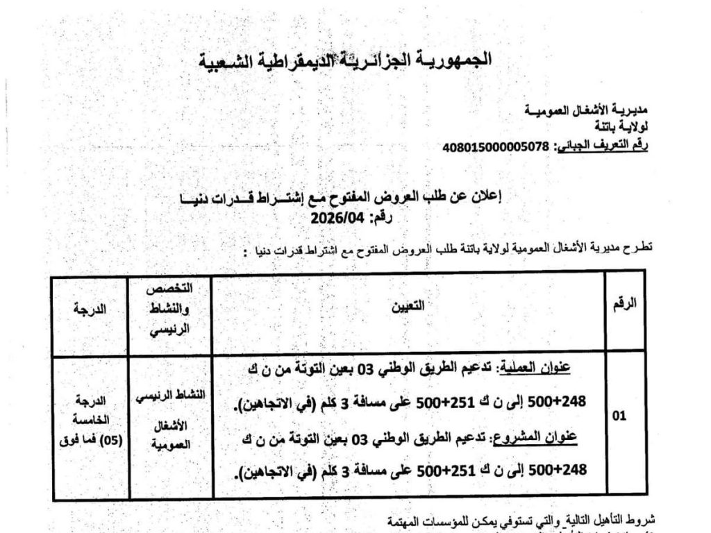 - إعلان عن مناقصة وطنية مفتوحة مع اشتراط قدرات دنيا