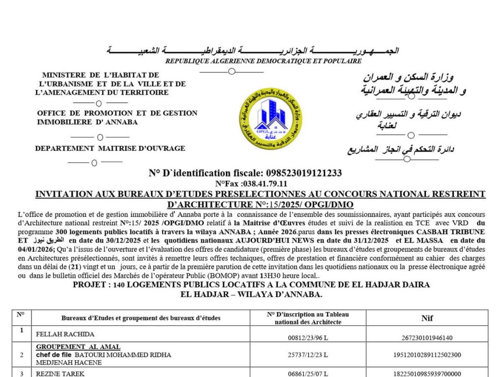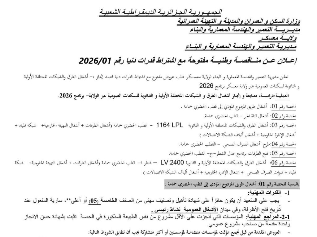 - دراسة، متابعة و إنجاز أشغال الطرق و الشبكات المختلفة الأولية و الثانوية للسكنات العمومية عبر الولاية - برنامج 2026