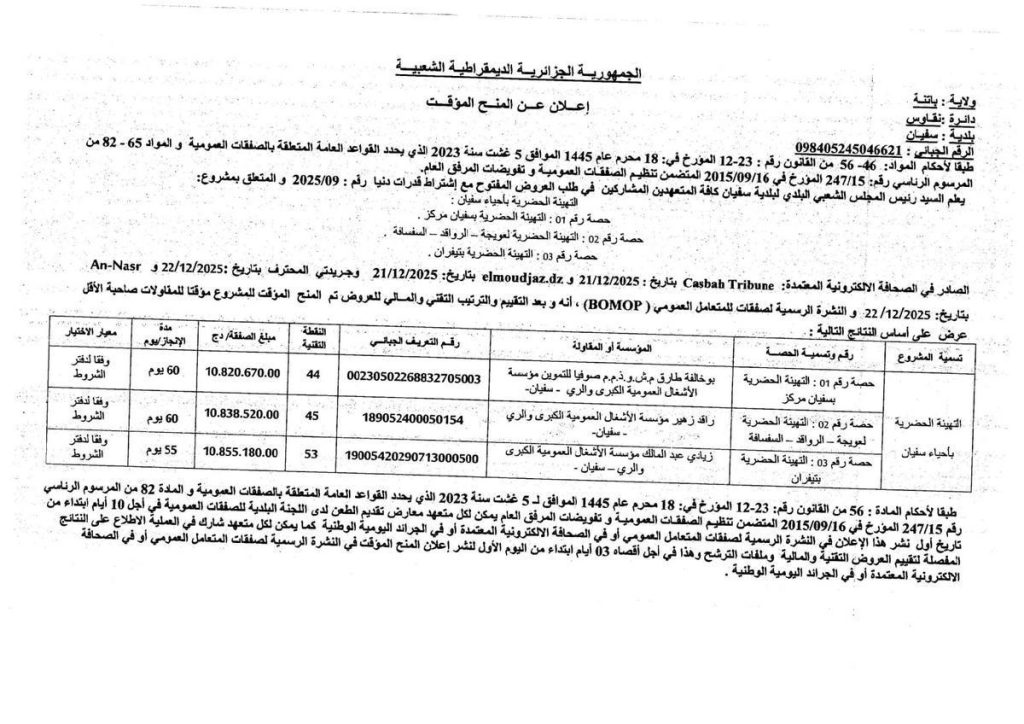 - اقتناء سيارات سياحية ونفعية لفائدة الإدارة المركزية ومديريات الولايات للأشغال العمومية والمنشآت القاعدية، في حصتين مختلفتين