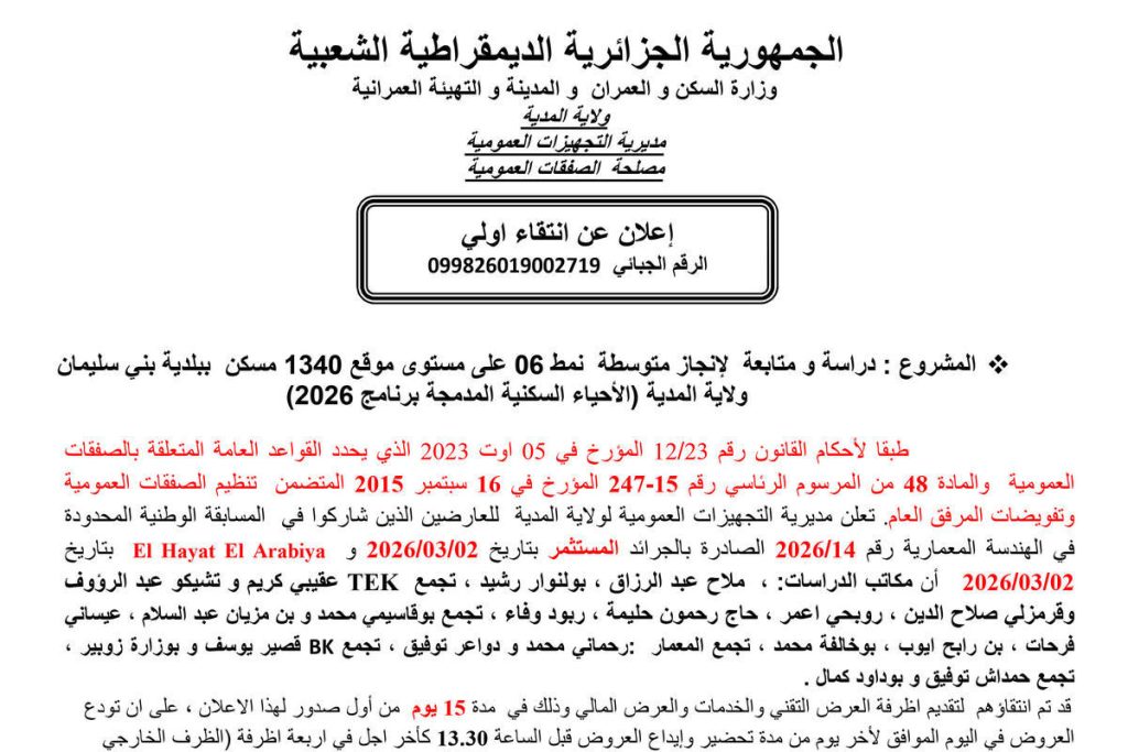 - دراسة ومتابعة لإنجاز متوسطة صنف 6 على مستوى موقع 1340 مسكن ببلدية بني سليمان - وﻻية المدية (الأحياء السكنية المدمجة 2026)