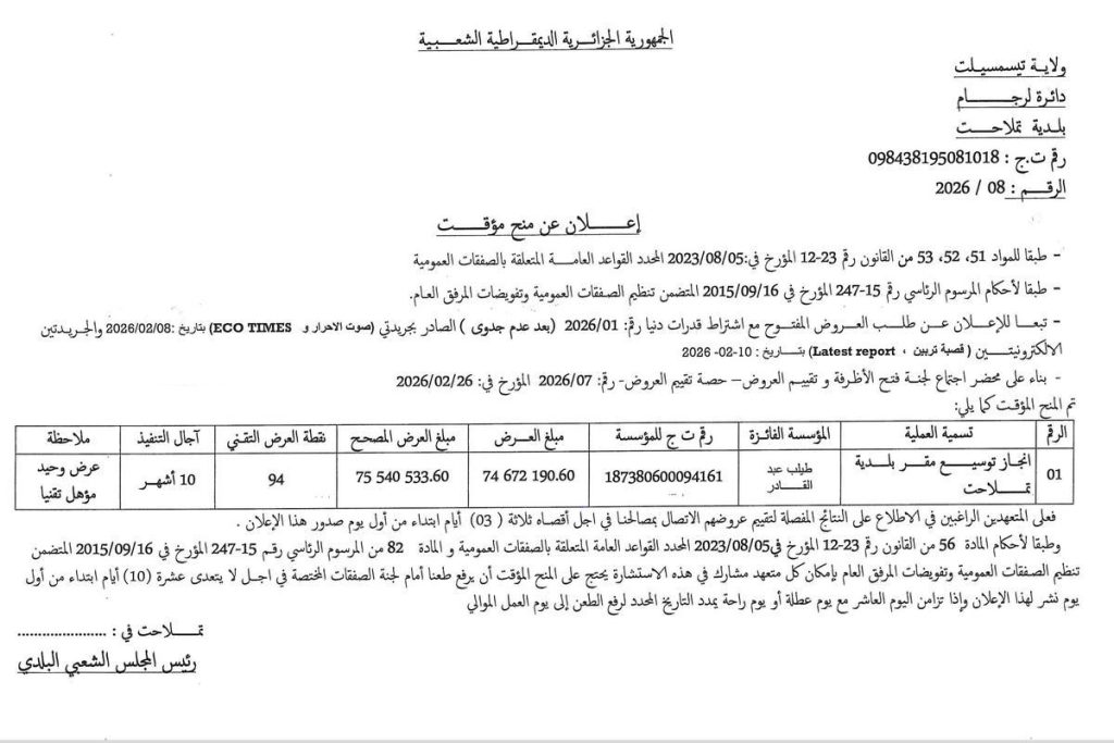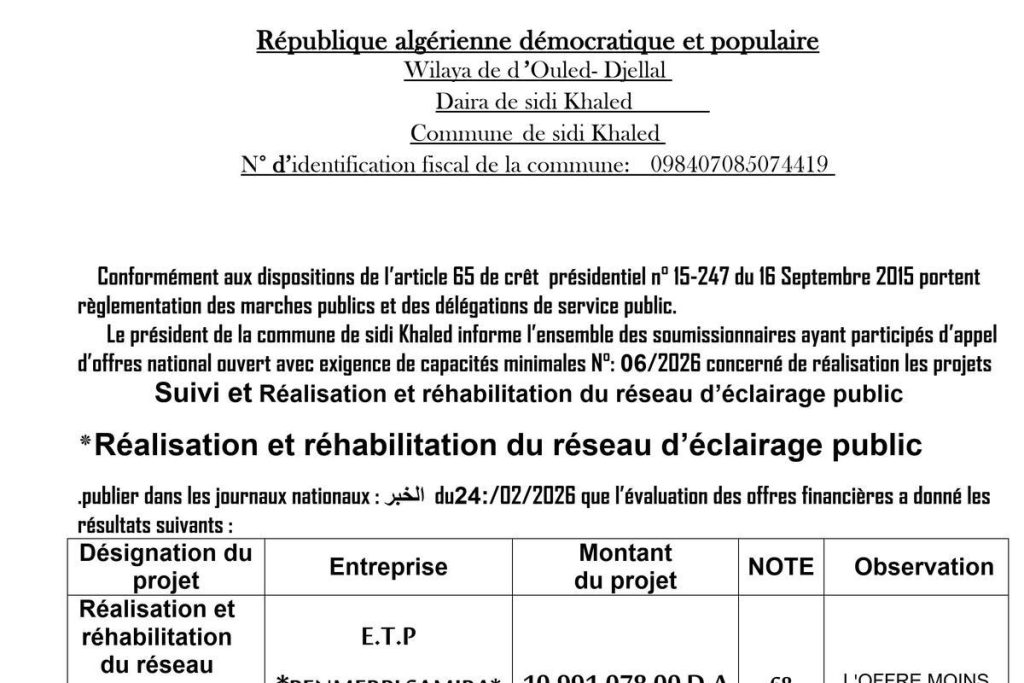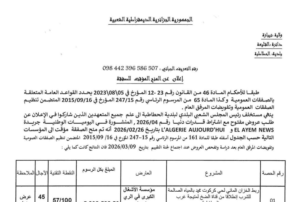 - إنجاز شبكات الصرف الصحي والمياه الصالحة للشرب عبر مختلف قرى البلدية لسنة 2026، في ثلاث 03 حصص
