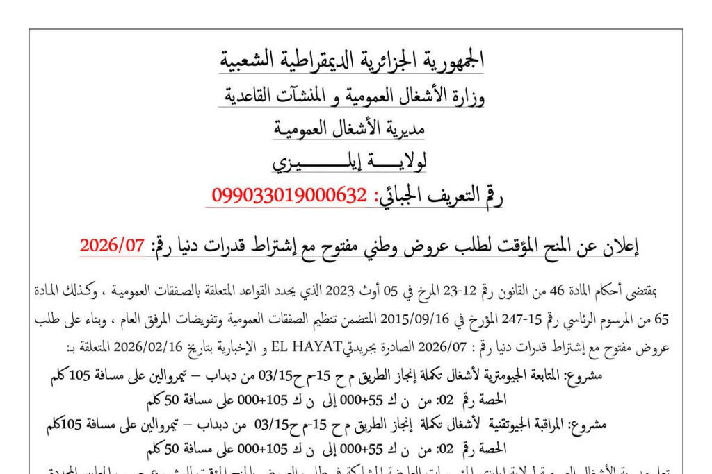 - مشروع المتابعة الجيومترية ومشروع المراقبة الجيوتقنية ﻷشغال تكملة إنجاز الطريق م.ح 15 - م.ح 03/15 من دبداب - تيمروالين على مسافة 105ﻛلم
