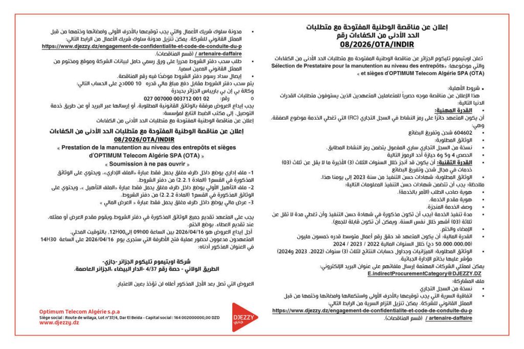 - Prestation de la manutention au niveau des entrepôts et sièges d'OPTIMUM Telecom Algérie SPA (OTA)