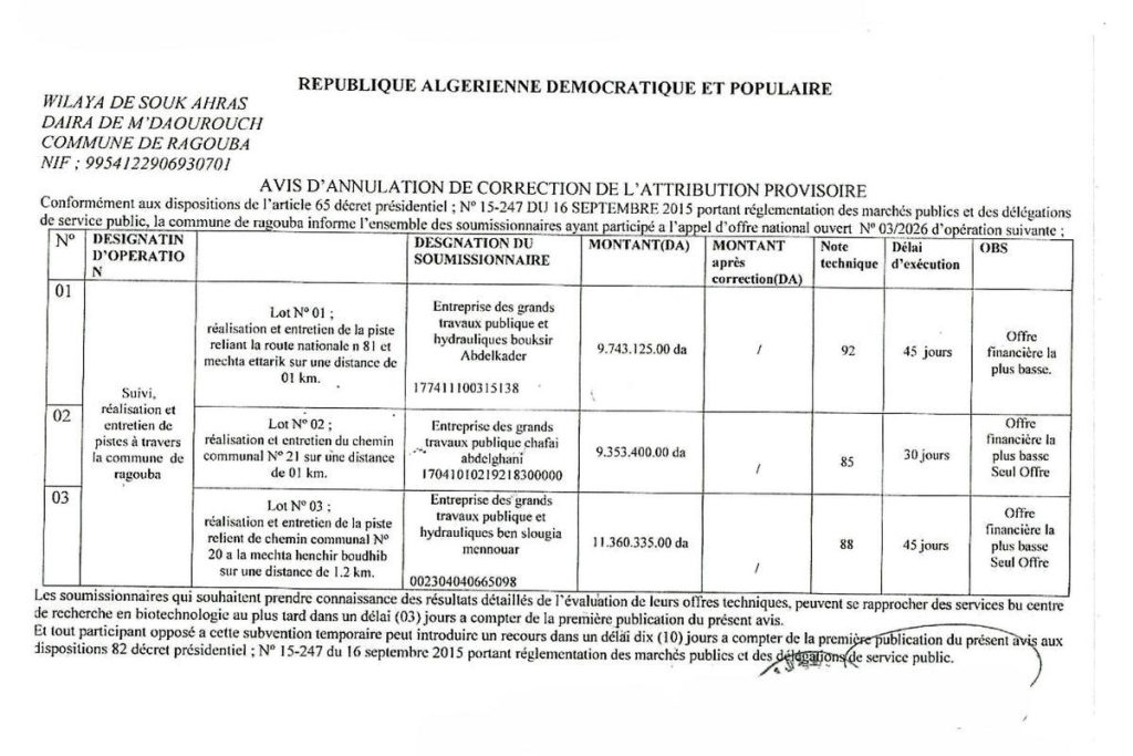 - Suivi, réalisation et entretien des pistes à travers la commune de Ragouba, en 03 lots