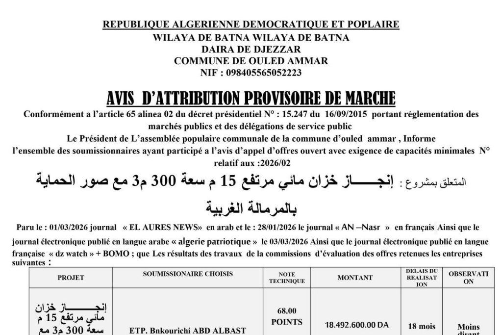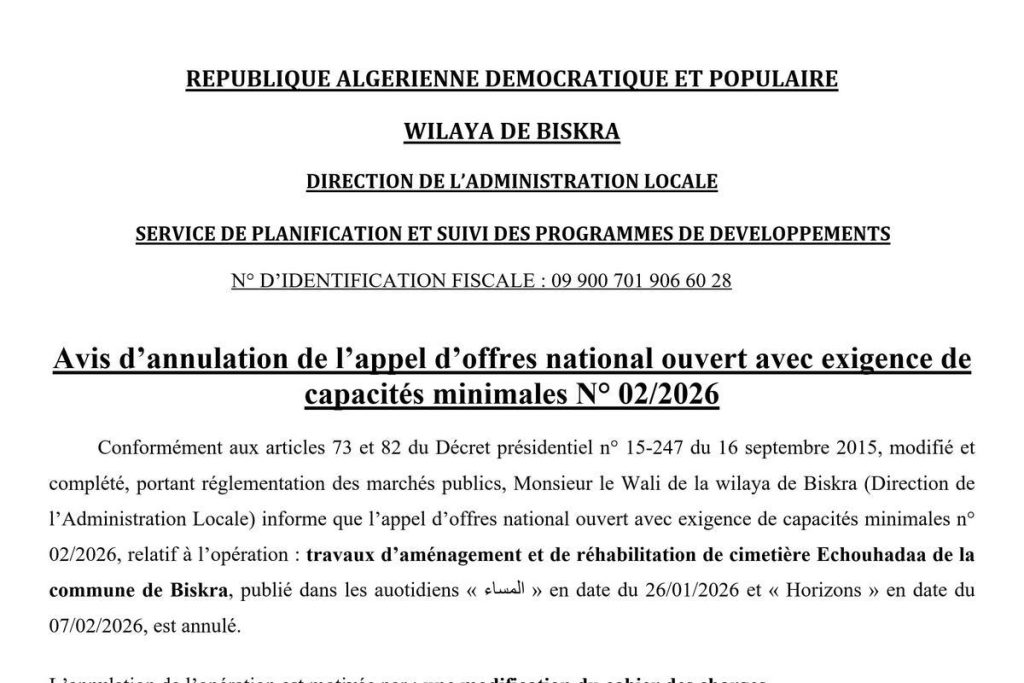 - Travaux d’aménagement et de réhabilitation du cimetière Echouhadaa de la commune de Biskra