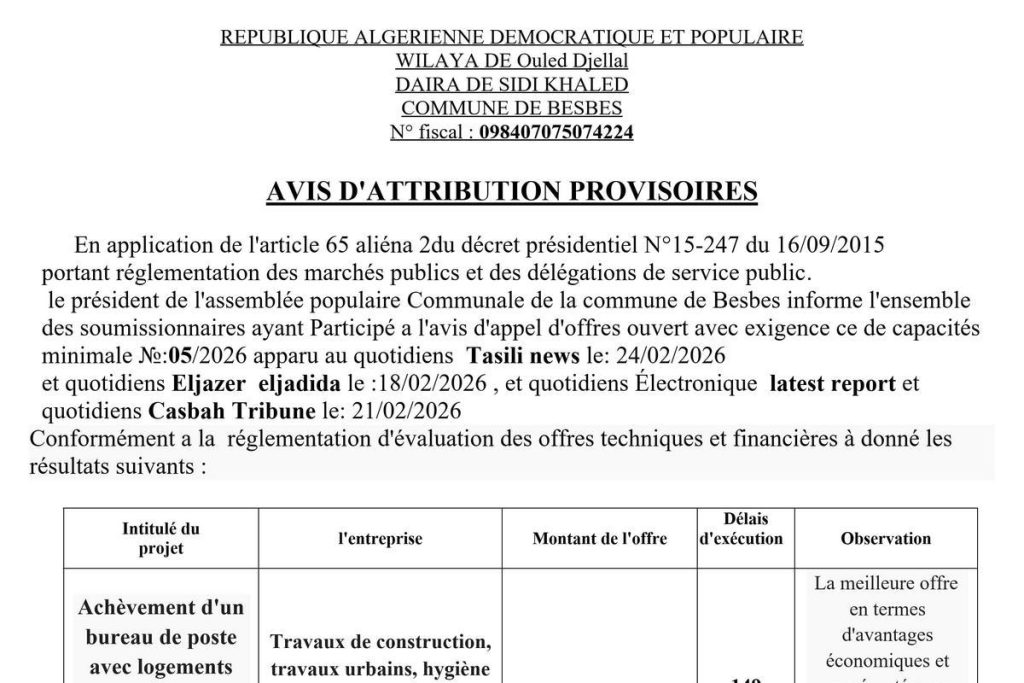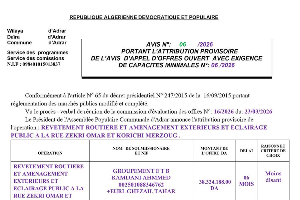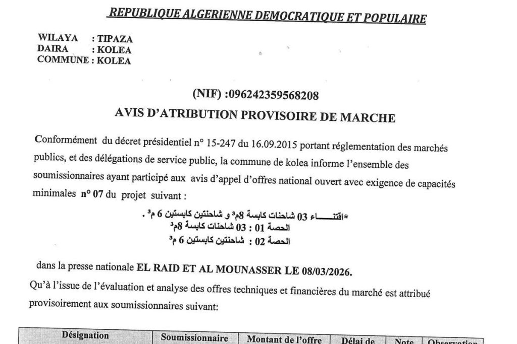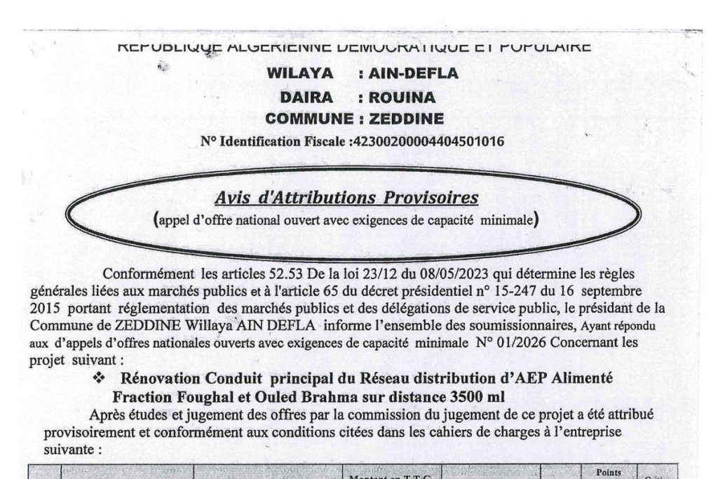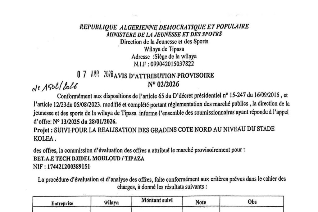 - Avis d'attribution provisoire