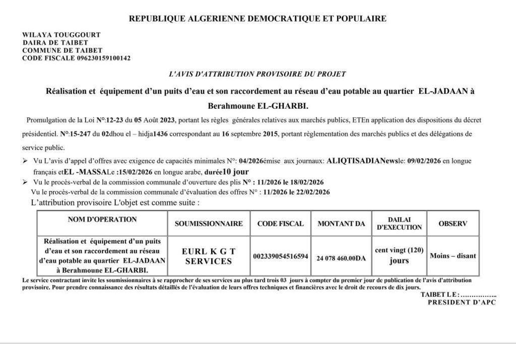 - Réalisation et équipement d’un puits d’eau et son raccordement au réseau d’eau potable au quartier El-Jadaan à Berahmoune El-Gharbi