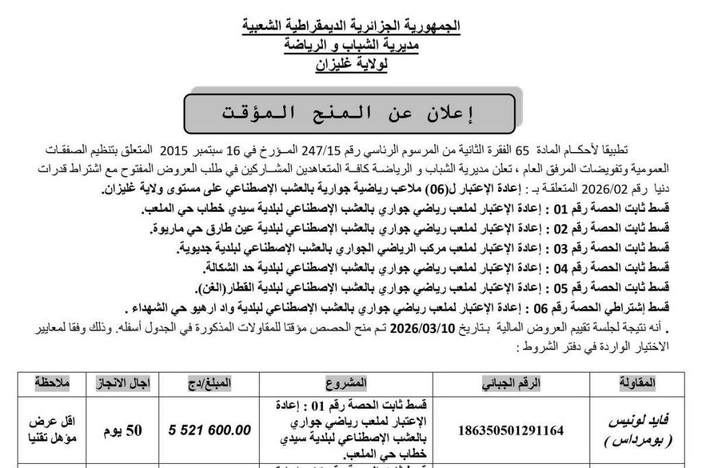 - إعادة الاعتبار لستة (06) ملاعب رياضية جوارية بالعشب الاصطناعي على مستوى ولاية غليزان، في 06 حصص
