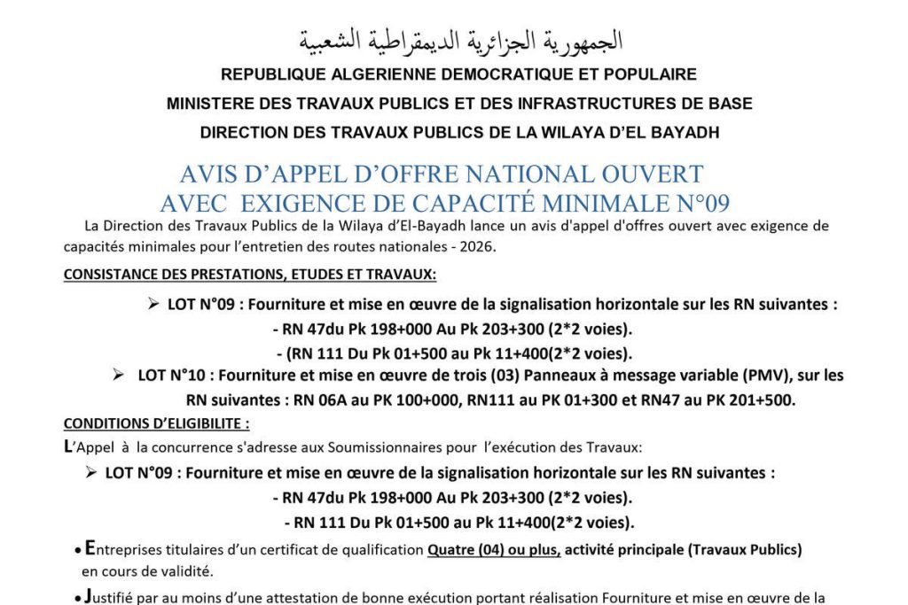- Entretien des routes nationales - Exercice 2026 : Fourniture et mise en œuvre de la signalisation, Lots N° 09 et 10