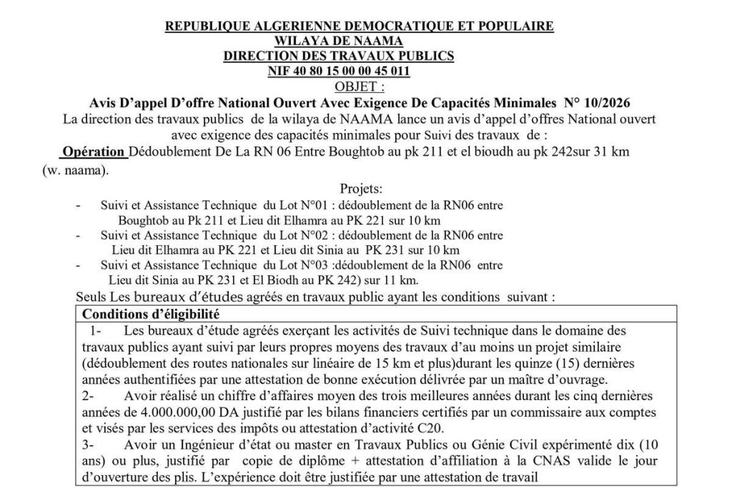 - Dédoublement de la RN 06 entre Boughtob au PK 211 et El Bioudh au PK 242, sur 31 km - Wilaya de Naama, en 03 lots