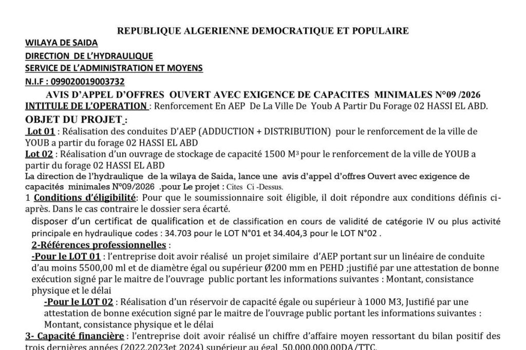- AVIS D'APPEL D'OFFRES OUVERT AVEC EXIGENCE DE CAPACITES MINIMALES