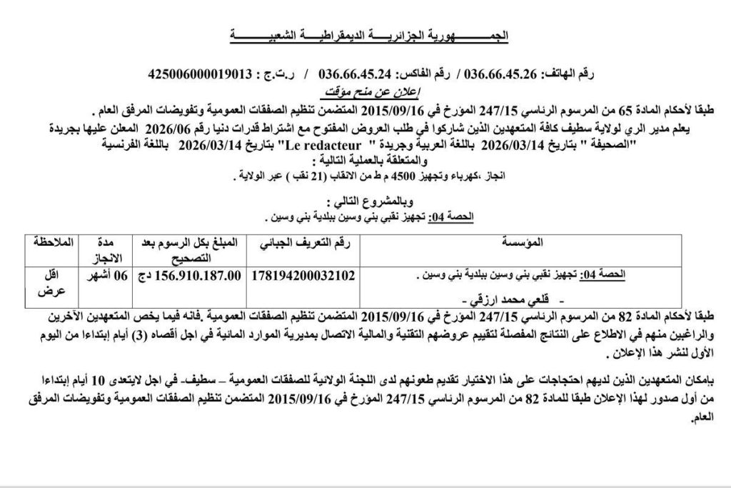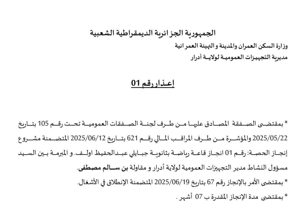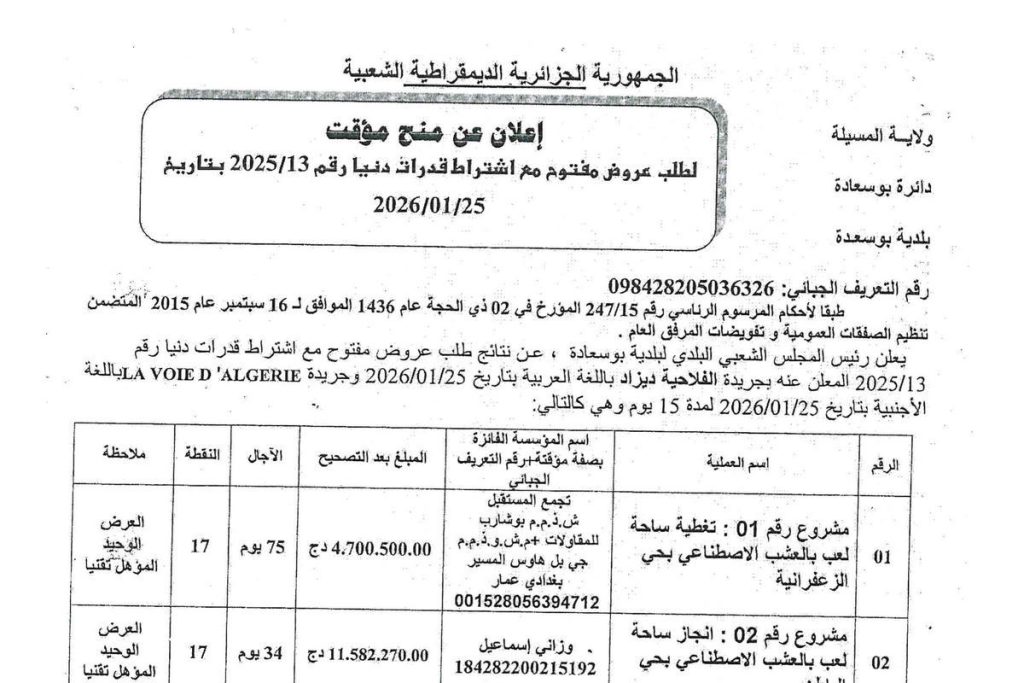 - الشركة: مقاولة بن سالم مصطفى، المشروع: الحصة رقم 01: إنجاز قاعة رياضة بثانوية جبايلي عبد الحفيظ أولف، الصفقة: رقم 105 بتاريخ 2025/05/22