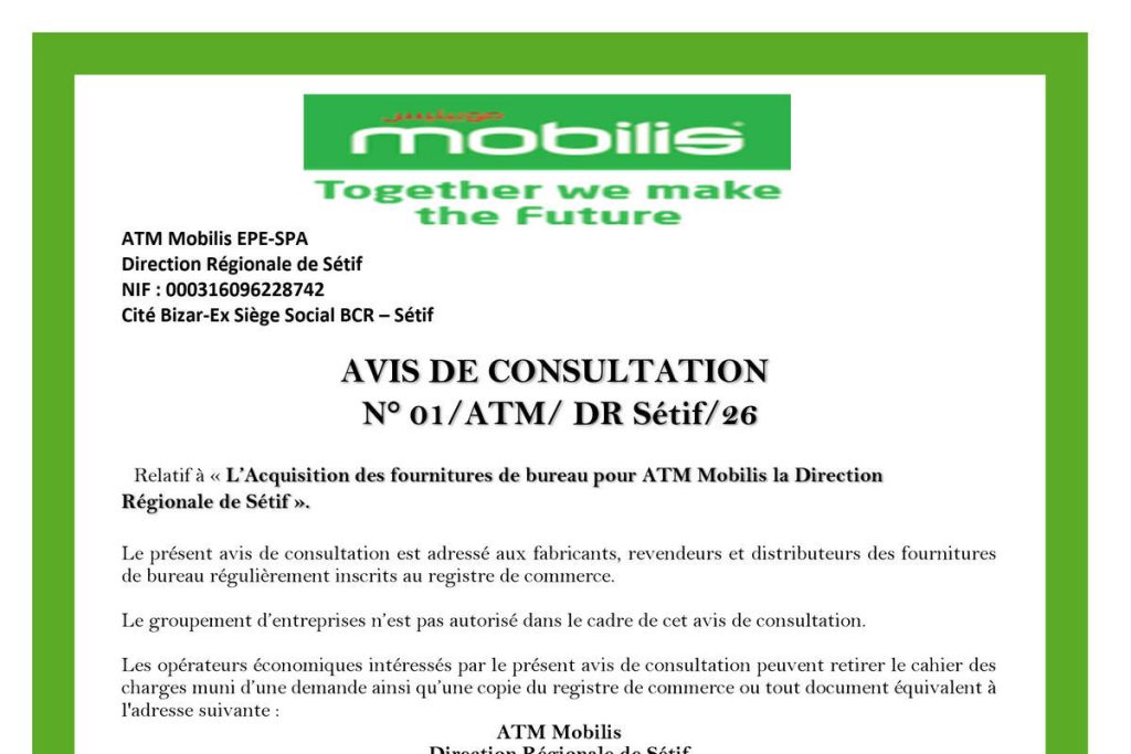 - Acquisition des fournitures de bureau pour ATM Mobilis la Direction Régionale de Sétif