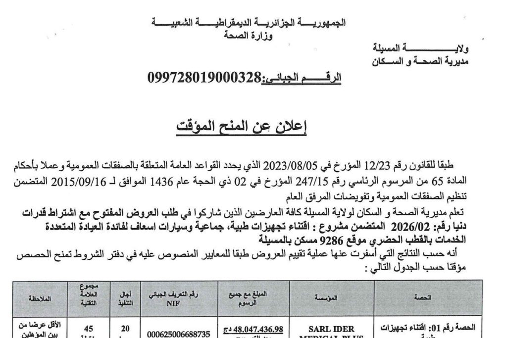 - اقتناء تجهيزات طبية، جماعية وسيارات إسعاف لفائدة العيادة المتعددة الخدمات بالقطب الحضري موقع 9286 مسكن بالمسيلة، في خمس 05 حصص