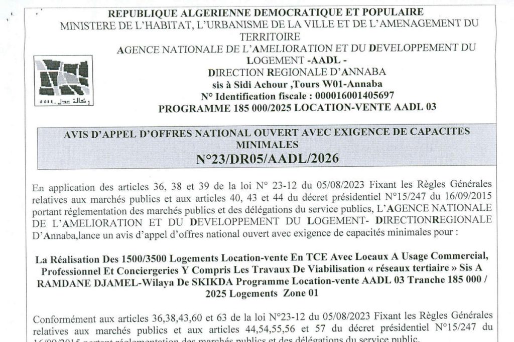 - Réalisation de 1500/3500 logements "Location-Vente" en TCE avec locaux à usage commercial, professionnel et conciergerie y compris les travaux de viabilisation "Réseaux tertiaires", sis à Ramdane Djamel, Wilaya de Skikda, Programme Location-Vente AADL 03, Tranche de 185 000 / 2025 logements, zone 01
